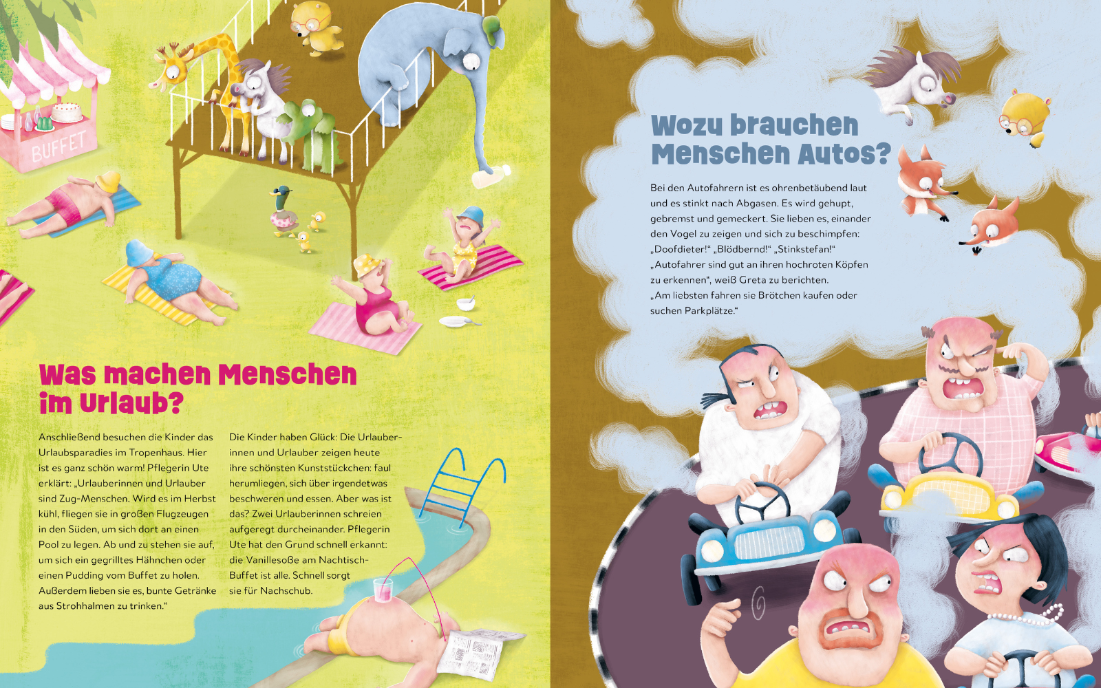 Tiere beobachten die Menschen im Zoo – mit vielen witzigen Details zum Entdecken und Darüber-Reden.